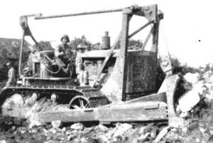 Gene Fiducia operating D7 angle dozer somewhere in Normandy June 1944. Demolishing stone house for gravel to construct and repair bombed roads.