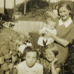 This is me (bottom left) with my Auntie Muriel who is holding my cousin Ken and my other cousin Norma outside our air-raid shelter in Courtney Street, Swansea before we were bombed out in Feb 1941