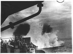 This picture was taken aboard HMS Resolution whilst under heavy attack by aircraft, it comes from a sequence that shows the plane (a Dornier I think) coming in on a attack run and then releasing a bomb which only just misses (as you can see!) then banks away under heavy "Flak"...