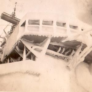 This picture is from Harry Wright’s personal collection taken while he was on board HMS Kent. It shows the ship's bridge covered in ice.