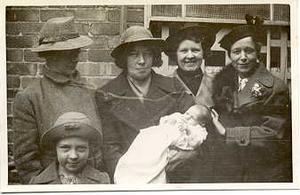 The picture is of my christening in April 1941. It was held at St John’s Church in Kidderminster. Note the tape on the windows; this was part of our blackout precautions. My mom is the lady wearing the fox fur on the right. The other ladies are Miss Hopkins on the left and my two godmothers Nancy Edmonds and Gladys Price.