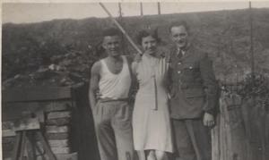 Percy Holmes (in Civvies) on 72-Hour Leave, Olive Holmes, Frank Huxley (Brother-in-Law), just arrived on 72-Hour Leave.Back garden, Wordsworth Rd - Air Raid shelter on left.