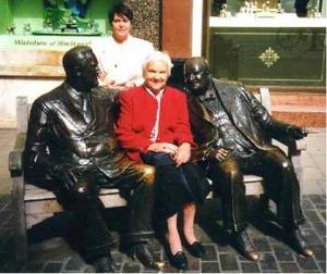 The photograph with this story was taken in April 1999 on the occasion of my 80th birthday. As a treat, my neighbours had driven me up to London to have tea at The Ritz Hotel. We arrived a little early and as the weather was fine, we decided to wait outside. It was then that we discovered the seat with statues of Winston Churchill and President Roosevelt. When I saw Winston Churchill's statue on the seat, I just couldn't resist sitting down next to him. He had been my hero since that memorable day in 1940 - and at least on this occasion (some 59 years later), I felt suitably dressed!