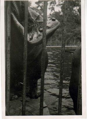 Opening up for his meal. Hippo takes his meal at Cairo Zoo, Egypt 1943