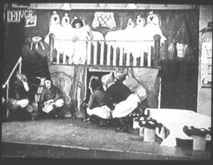 A camp performance of Snow White and the Seven Dwarfs. There were one or two professionals among the internees, one of whom was a certain Mrs Thompson. The ladies designed all the stage set and props and the camp commandant condescended to attend the performance with his aide. They kept a straight unsmiling face throughout.