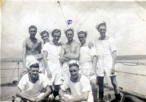 Mombasa 1942 Eastern Fleet stoker shipmates on board HMS Ramillies. Stoker Mechanic T A Russell D/KX100469 standing third from right