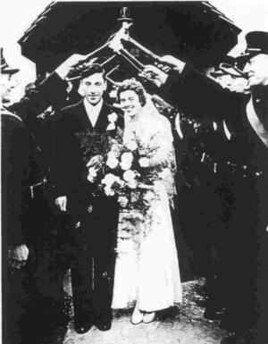 On October 21st 1939, Dick (Richard) Wilkins and his young lady Muriel Keys, were married at the little Elim Church in Castle Road, Rayleigh, Essex. He was a member of the auxiliary fire service at the time, so his comrades held up an archway of axes for them to walk through. This was the first civilian forces wedding to be held in the district.