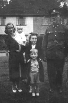 BROOKS FAMILY Left to Right: ‘Doll’ (Violet) Brooks (nee Ames, 35) with new baby Jasmine; Beryl (9) behind Brian (4); Corporal Harry Brooks (36) Royal Artillery Searchlights, Home Defence. Pictured on Taylors Green, East Acton May 1940. Photo: ‘Glad’ Ames.