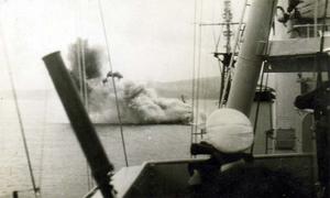 Moment of impact as HMS Saumarez hits mine in Corfu Channel, October 22, 1946. Spray still in air as the ship lists as she still moves lost 32 men T A Russell D/KX100469
