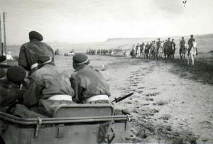 Watching French cavalry before leaving Beirut leave camp January 1946