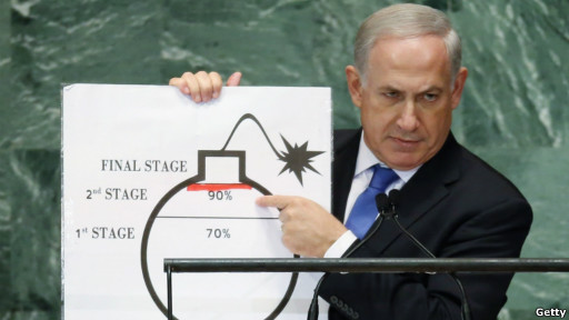 Dalam Sidang Umum PBB, Netanyahu mengatakan Iran bisa memperoleh cukup bahan untuk membuat sebuah bom nuklir pada tengah tahun mendatang, dan sebuah pesan yang jelas dibutuhkan untuk mengentikan Iran.