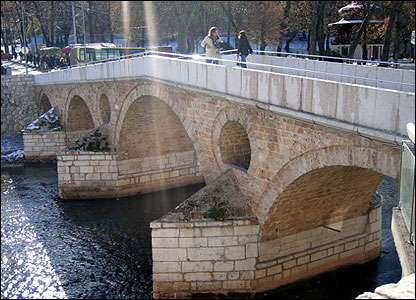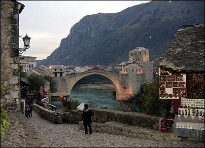 Познатиот „Стар мост“, изграден во 1566 од школата на мимарот Синан, беше урнат од хрватски генерал во 1993, но сега е обновен и претставува незаобиколен симбол на Мостар, најголемиот град во Херцеговина. | ЛОКАЛНИ ЛИНКОВИ Етнички поделби во Босна и Херцеговина30 Декември, 2008 | Вести Повратнички приказни од Босна30 Декември, 2008 | Вести Негирање дека „Босна е пред колапс“30 Декември, 2008 | Вести Разурнувањата и обновата на Мостар30 Декември, 2008 | Вести „Сакам да се движам низ времето“30 Декември, 2008 | Вести Репортажа на БиБиСи од Босна и Херцеговина02 Јануари, 2009 | Вести | |||||||||||||||||||||||||||||||