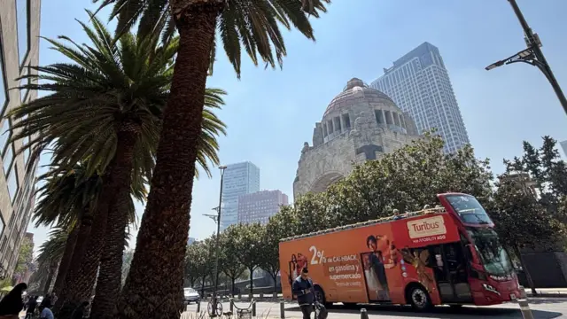 Pie de foto, El Monumento a la Revolución, detrás del autobús, es el símbolo principal de Little L.A.