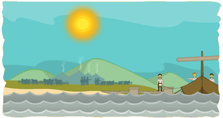 Seo duit, beir greim ar an rópa sin. Maith go leor, cuirimis iad seo i dtír. Haigh, tusa, a dhuine óig, siúil leat an bealach seo.