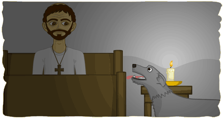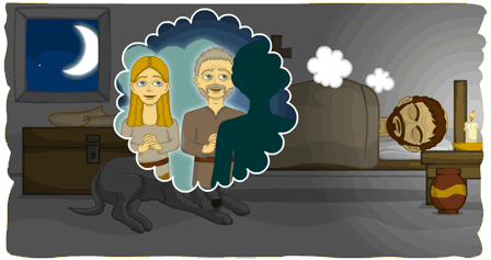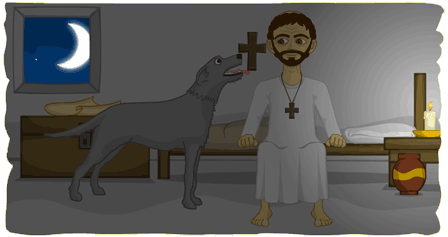 Maith mo mhadadh. An bhfuil a fhios agat go ndearnadh brionglóid dom go raibh muintir na hÉireann ag glaoch orm dul ar ais chucu? (Ceann an mhadaidh á thochas aige.) Bhí mé i mo sclabhaí in Éirinn fadó. Cad é atá i gceist?