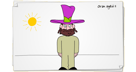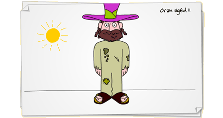 I think he was tall and very skinny and he had ginger hair and he had green clothes and a tall green top hat with a wee buckle on it.