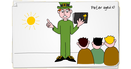 I think St Patrick had a beard, long and scruffy and had long hair, long and tatty – not brushed and wore green robes and wore sandals on his feet.