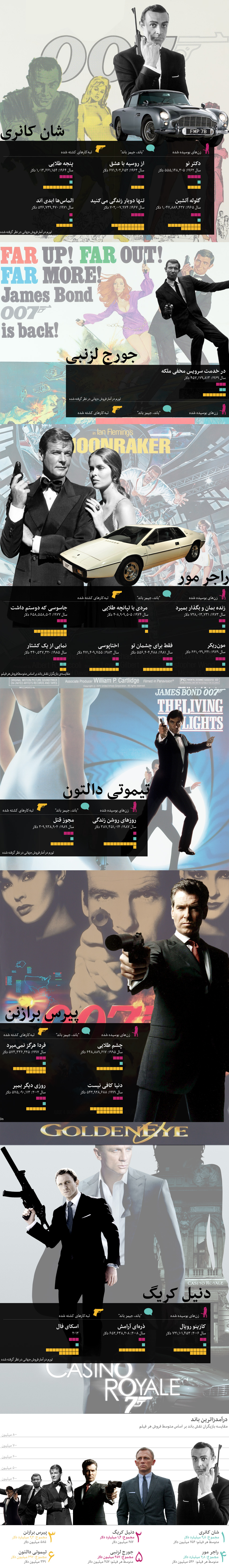 اسکای فال، سومین فیلم دنیل کریگ در نقش مامور دو صفر هفت است، ولی این بازیگر در مقایسه با سایر بازیگران این نقش در چه جایگاهی قرار دارد؟ ما مجموع درآمد فیلم های جیمز باند را در سرتاسر جهان در زیر نشان داده ایم، و گروهی نیز همه ۲۳ فیلم را تماشا کرده اند تا ببینید که در هر فیلم، بازیگر نقش باند چند زن را بوسیده، چند بار تکیه کلام "باند، جیمز باند" را بیان کرده و چند تبهکار را کشته است. برای دیدن این اطلاعات تا انتهای صفحه را مشاهده کنید: