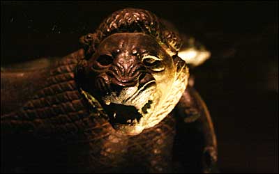 تابوتی به شکل وان حمام در اتاقی که مربوط به مذهب و رسوم هخامنشیان می شه ، یک وان بزرگ فلزی دیدم که یک اسکلت کوچک داخلش خوابیده بود. گردنبندها و کوزه ها و بشقابی در کنارش گذاشته بودن. این در واقع بازسازیه یک قبر سلطنتیه که توسط فرانسویها در شوش کشف شده.