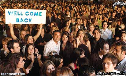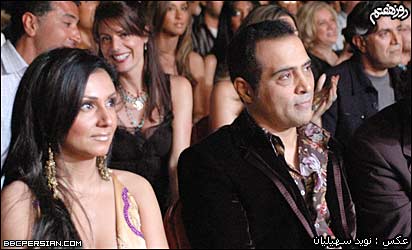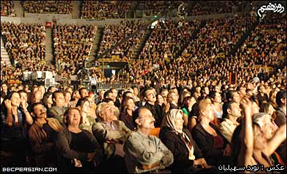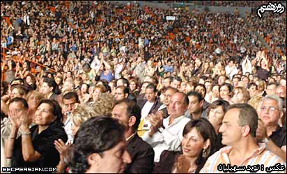 گوگوش ضمن قدردانی از زحمات مهرداد که به گفته او در اين مدت "يار" او بوده و "بهترين ها" رو به او هديه کرده، از او دعوت کرد که به روی صحنه بياد و ترانه های دو صدايی را با هم اجرا کنند. | | مهرداد آسمانی به همراه همسرش در کنسرت لس آنجلس |