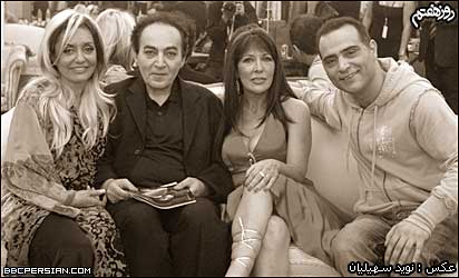 مهرداد وقتی به روی صحنه آمد دست گوگوش را بوسيد و گفت" نفس کشيدن با گوگوش روی صحنه خيلی سخته چه برسه به خواندن". | | از چپ به راست: گوگوش، شهيار قنبری و همسرش و مهرداد آسمانی |