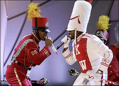 کانيه وست (راست) به سه جايزه دست يافت و با جيمی فاکس بازيگر هاليوود که به تازگی در زمينه خوانندگی هم فعال شده، اجرای مشترکی داشتند. |