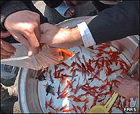 شيلاتی ها می گويند دست کم دو هزار نفر در سراسر کشور به طور مستقيم در پرورش ماهی قرمز دست دارند، اما اين مربوط به واحدهايی است که مساحت شان از ۱۰۰ متر افزون تر است و از شيلات پروانه دريافت کرده اند و گرنه تعداد پرورش دهندگان خانگی بايد به مراتب بيشتر باشد. اين عده اخير را در زمره فقيرترين و خرده پاترين توليدکنندگان ماهی به شمار می آورند و هزاران دستفروش را که در بخش های پايين دستی شبکه توزيع فعال اند، بر تعدادشان می افزايند. کار تکثير اغلب بی آنکه آسيبی به ماهی برسد، انجام می گيرد و اگر در واحدهای بزرگ و تحت نظارت باشد با استانداردهای بهداشتی همخوانی دارد. اما گرفتاری ماهی قرمز از زمانی آغاز می شود که پای در چرخه توزيع می نهد. هزاران هزار ماهی در دبه های کوچک و بزرگ، سوار بر وانت يا کاميونت يا حتی پشت خودروهای سواری به مراکز فروش حمل می شوند و خود را در مرحله قيمت گذاری می يابند. گزارش يک خبرنگار از اين مراسم رقت بار چنين است: «تهران ، خيابان مولوی... دبه های سفيد از پشت وانت تخليه می شوند. چند نفر کنار دبه ها نشسته اند تا مراسم قيمت گذاری راحت تر انجام شود. ماهی های ريز، مريض و نه چندان خوش رنگ به سادگی جدا می شوند و روی زمين يا احتمالاً داخل جوی کنار خيابان پرتاب می شوند.»