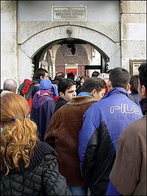 صف بلیت فروشی جلوی آرامگاه مولوی در شهر قونیه ترکیه که بربالای آن نوشته شده Mevlana Muzesi