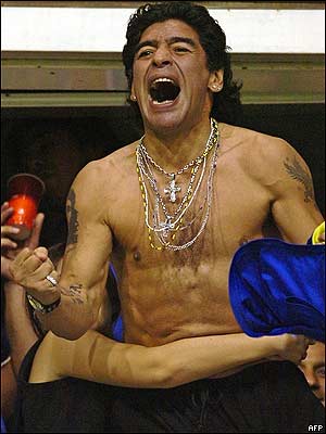 ديه گو مارادونا، بازيکن سابق تيم ملی آرژانتين و تيم بوکا جونيرز در حال شادمانی، پس از آنکه تيم سابقش در رويارويی با تيم پوماس مکزيک پيروز شد