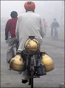 مرد شيرفروش هندی در يک روز مه آلود در يکی از خيابان های شهر امريتسار در غرب هند. مه غليظ باعث از هم گسيختگی رفت و آمد قطار ها و پرواز هواپيماها در شمال هند شده است.