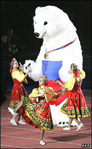 گروهی هنرمند که با لباس سنتی روسی در دور یک خرس میرقصند.
