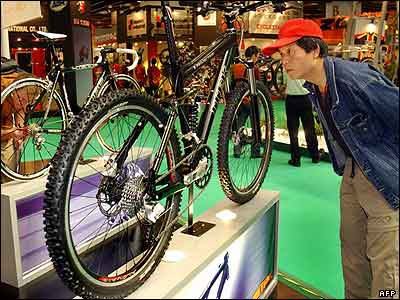 یک مرد تایوانی به دوچرخه ای نگاه می کند که در نمایشگاه بین المللی دوچرخه در تایپی به نمایش گذاشته شده است.