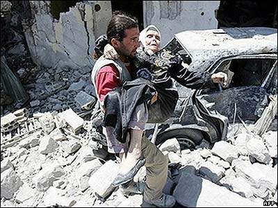 وائل لادکی، عکاس لبنانی، زن سالخورده ای را که از حملات نيروهای اسرائيلی جان بدر برده از ميان خرابه ها بيرون کشيده است.