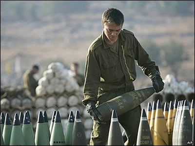 سرباز اسرائيلی گلوله های يک توپخانه را در شمال اسرائيل آماده می کند.