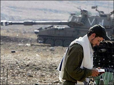 سرباز اسرائيلی در حال عبادت در کنار يک واحد توپخانه سيار.