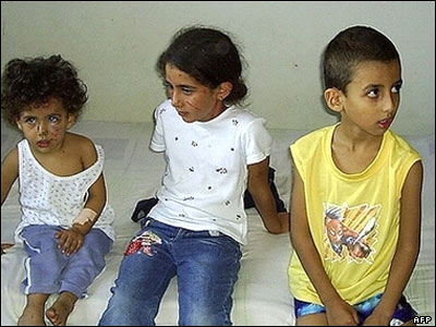 کودکان مجروح لبنانی در خانه شان در روستای بدی بمبارانهای شب گذشته لبنان باعث مختل شدن جريان کمکها و همچنين خروج مردم از لبنان به سوريه شد.