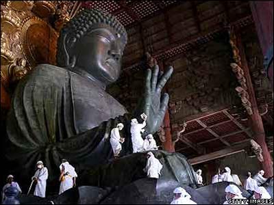 راهبان در حال غبار روبی از مجسمه بودای بزرگ در معبدی در ژاپن.