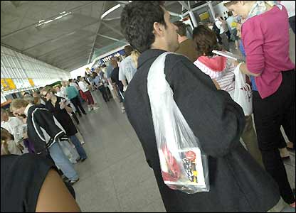 از ساعت شش صبح روز پنجشنبه، 10 اوت، صف های انتظار در فرودگاه های لندن تشکيل و با گذشت زمان به طول آن اضافه شد. فاصله اين مسافر با محل بازرسی در فرودگاه استانستد به ۵۰۰ متر می رسد.
