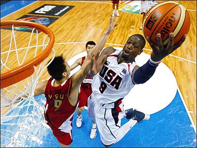 رويارويی تيم های ملی بسکتبال چين و آمريکا در مسابقات جهانی بسکتبال در شمال ژاپن. |