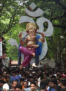 پيروان آيين هندو در آغاز جشن مذهبی گنيش، خدای ثروت و دانش. اين مراسم ده روزه با غسل مجسمه گنيش در دريای عرب پايان می يابد.