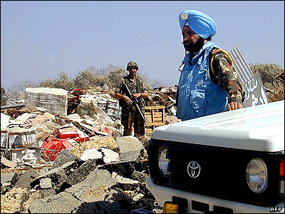 گشت زنی يک سرباز لبنانی و يک سرباز پاسدار صلح سازمان ملل متحد در جنوب لبنان. اتحادیه اروپا ابراز امیدواری کرده است که بتواند نیمی از پانزده هزار سرباز پاسدار صلح مورد نياز سازمان ملل متحد را برای اعزام به جنوب لبنان تامین کند.
