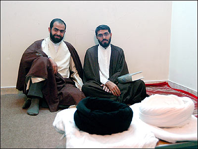 پيش از آغاز مراسم عمامه گذاری سيد مهدی (چپ) و شيخ حسين سوگند می خوردند که در راه اسلام قران قدم بردارند.