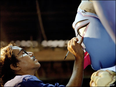 هنرمندی هندی در حال تزیین مجسمه "کالی"، الهه قدرت. مردم در اکثر نقاط هند در حال آماده شدن برای استقبال از جشن دیوالی هستند.