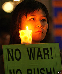 يک تظاهر کننده در کره جنوبی با حمل پلاکارد و شمع به سفر کاندوليزا رايس وزير خارجه آمريکا به کشورش اعتراض ميکند.