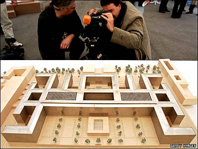 خبرنگاران در مراسم افتتاح ستاد مرکزی سرويس اطلاعاتی کشور آلمان ماکت کوچکی از اين مرکز را بررسی می کنند.