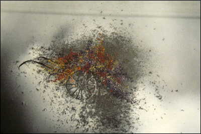 مدتی است دلآرا دارابی برای نقاشی کشيدن دچار مشکل شده است. او برخی از اين طرحها از جمله اين چهره در هم پيچيده را به دليل نداشتن قلم مو با انگشت و ناخن و اندکی رنگ سياه کشيده است.