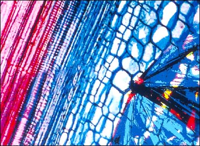 برندگان مسابقه عکس جلوه های دانش: نفر نهم و دهم | | ساختمال سلولی ظريف ساقه گل آفتابگردان. بخش های آوندی قرمز و بافت های محافظ آبی هستند. طرح پروانه در کنار عکس ديده می شود - عکس اثر ريچال شيلکاک |