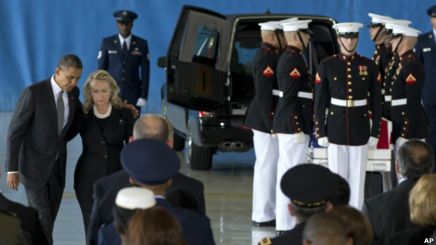 اغلب آمریکاییها روز جمعه شاهدان مبهوت تصویر رییسجمهور و وزیر خارجه کشورشان بر صفحه تلویزیون بودند که سوگوار و سیاهپوش بر فراز ۴ تابوت ایستاده بودند؛ تابوتهایی که اجساد دیپلماتهای کشتهشده در لیبی را به خاک آمریکا بازگرداند.