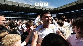 Alex Gilbey reacts after MK Dons are promoted to League One after beating Tranmere 3-0.