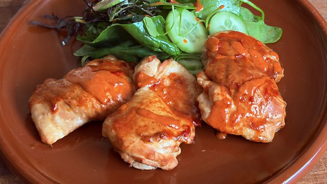Tea smoked brined chicken thighs with Peri Peri and cucumber salad